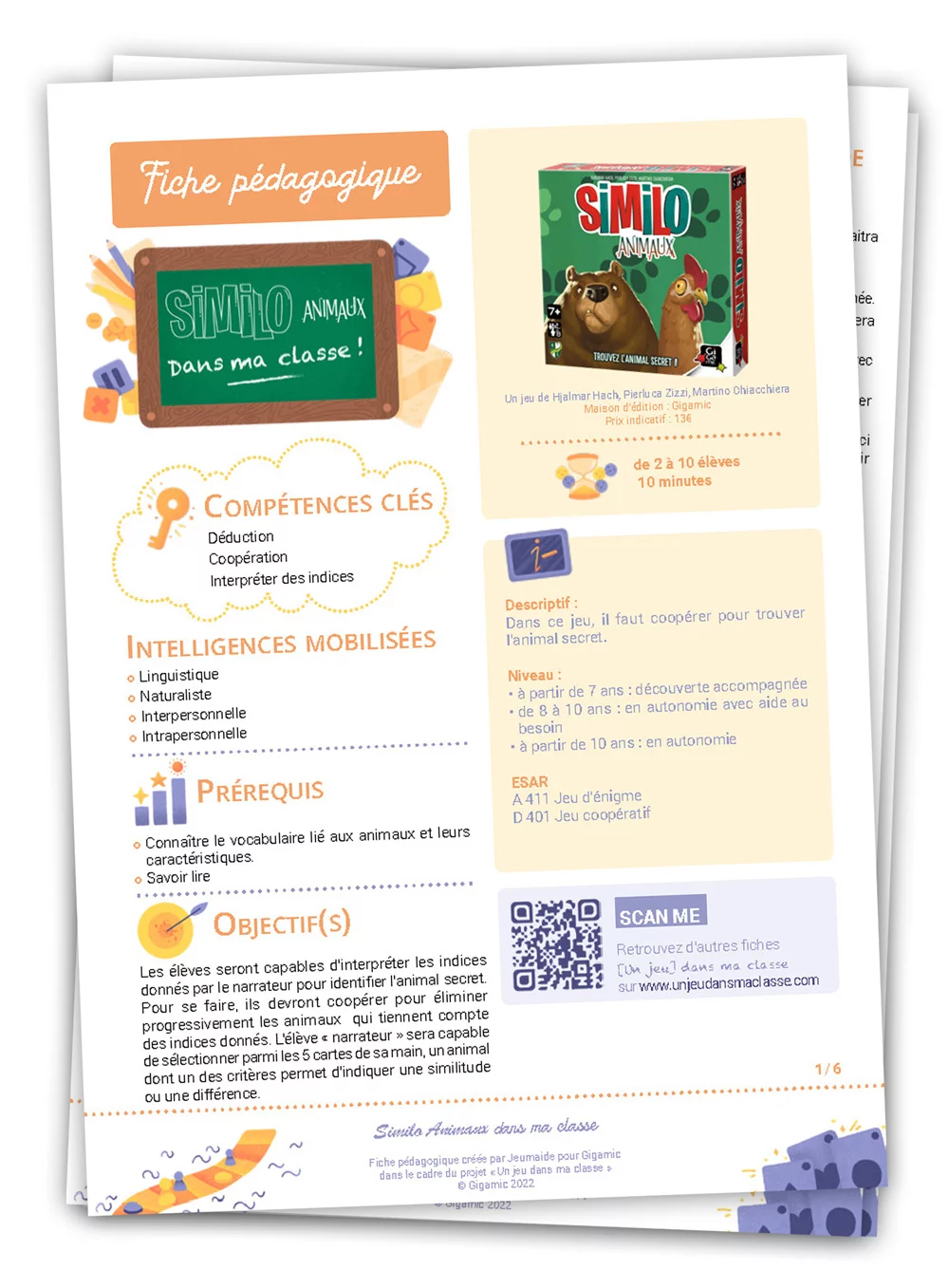 Oui. Certains jeux disposent de fiches pédagogiques [Un jeu] dans ma classe, spécialement conçues pour une utilisation en milieu scolaire. Elles permettent d’exploiter le jeu comme support pédagogique, avec des objectifs clairs et des compétences ciblées, tout en conservant le côté ludique.