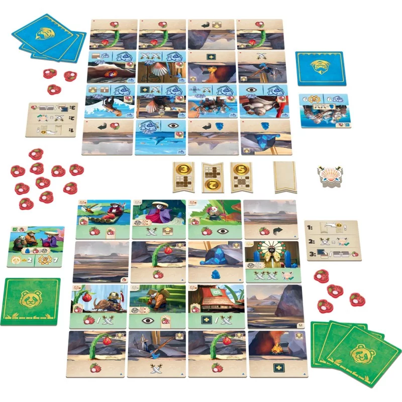 32 tuiles basiques recto-verso (16 pour chaque joueur), 52 cartes (7x7cm), 5 tuiles Action, 20 pions Nourriture, 9 pions Requin, 18 jetons Victoire Militaire, 4 fiches de Clan, 1 livret de règles |