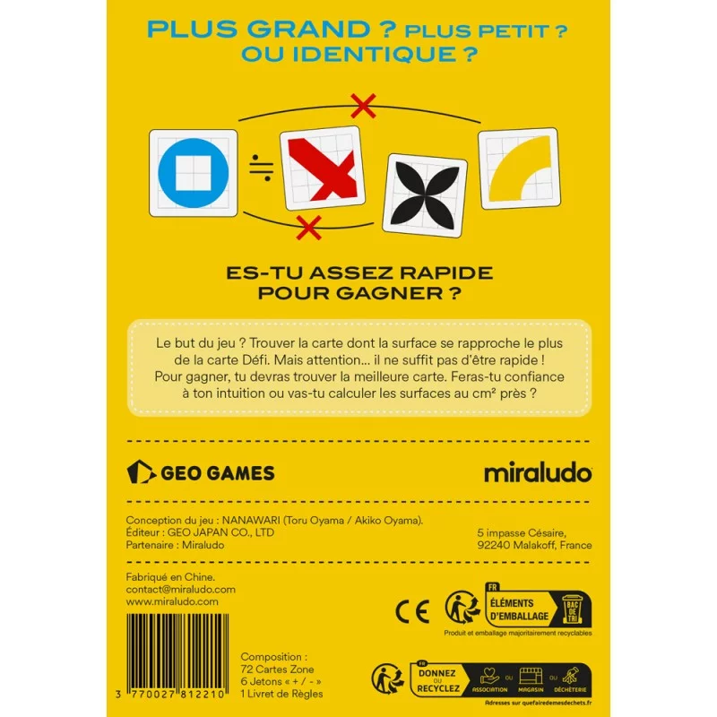 - Le but du jeu ? Trouver la carte dont la surface se rapproche le plus de la carte Défi.