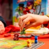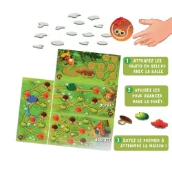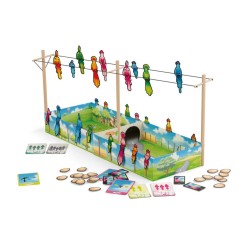 4 figurines en bois, 4 sacs en tissu, 1 plateau de jeu, 4 plateaux Circuit double face, 55 jetons en bois, un dé en bois, une rampe de saut, la règle du jeu |