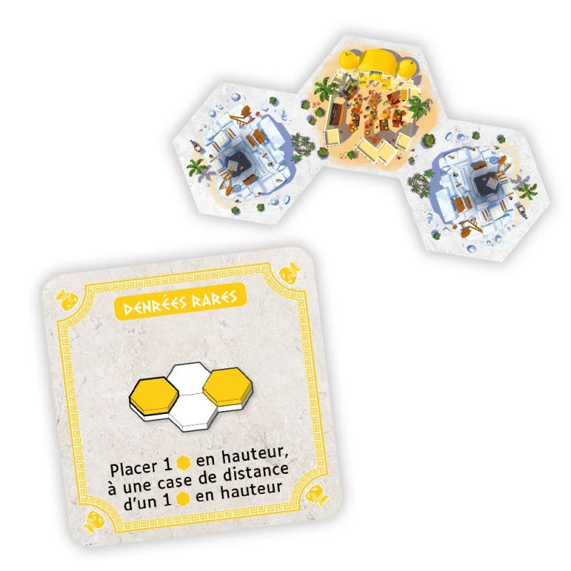 Les joueurs choisissent ensemble un scénario parmi Corinthe, Sparte ou Athènes, chacun proposant une difficulté différente. Chaque joueur reçoit une tuile de départ, tandis que les tuiles restantes forment le cœur de la Capitale. Trois tuiles Défi Architectural sont révélées, accompagnées de leurs Autels Divins correspondants. Les joueurs reçoivent également des cubes Pierre et des tuiles Cité, à garder en main comme des cartes. Contrairement au jeu de base, il n’y a pas de rivière.