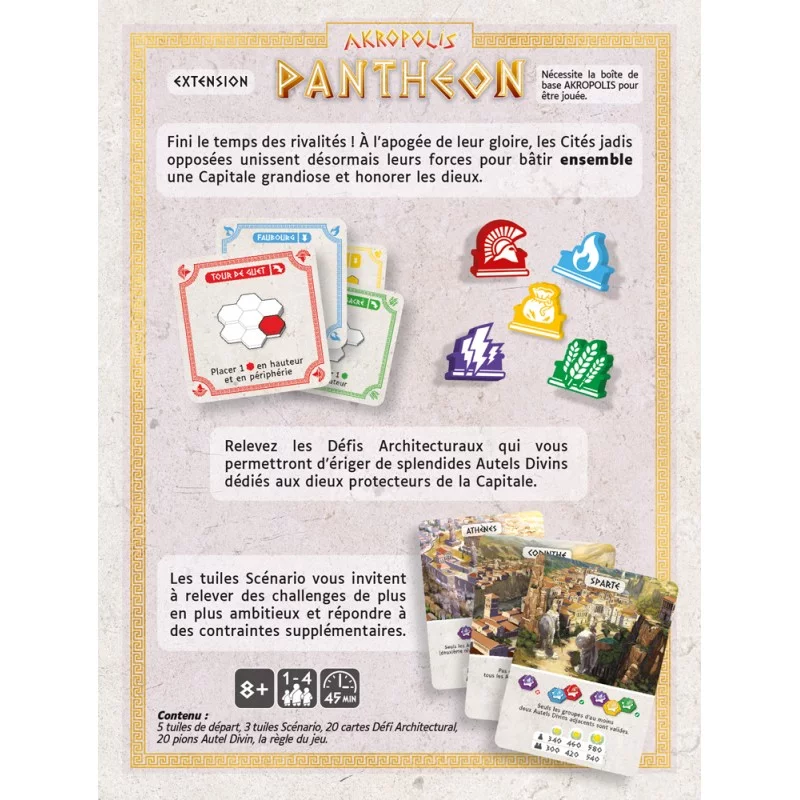 Akropolis Pantheon est une extension coopérative du jeu Akropolis. Le jeu de base est nécessaire pour jouer.