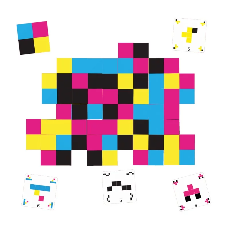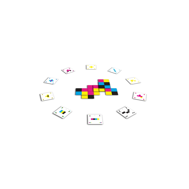 48 cartes Quadri 60*60mm composées de 4 carrés de couleurs différentes (Cyan, Magenta, Jaune et Noir), 42 cartes Objectif et un livret de règles |